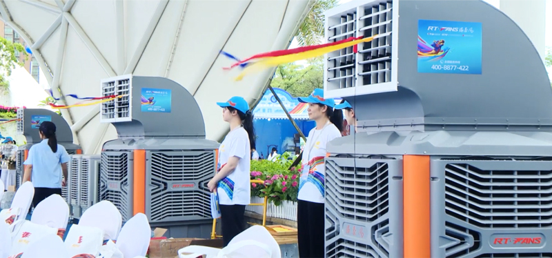 本次活動期間,瑞泰風經過現場實地考察,科學規劃,一次性投放了30套移動冷風機設備,其中包括經典版和體育版兩個系列產品,降溫效果顯著,安裝使用也非常便捷,確保各項室內、戶外賽事活動的順利開展。移動冷風機是一款節能環保的降溫設備,尤其適合戶外使用,僅需2分鐘即可將35℃的高溫降低到26~27℃,達到人體最舒適,也是多類體育項目最適宜的溫度環境。此外,移動冷風機送風距離遠,覆蓋范圍廣,單臺設備的送風距離可達30米,并且有效覆蓋120°扇形區域。